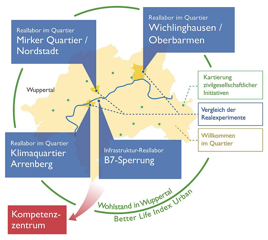 Als Teil der Transformation wurde im Reallabor "Essbarer Arrenberg" ein Leitbild lokaler nachhaltiger Ernährung entwickelt und ein entsprechender Strategieprozess aufgesetzt. Im Reallabor "Quartier Mirke" wurden Formate der partizipativen Quartiersentwicklung gefördert und eine Coforschungsgruppe gegründet. Im Reallabor "Wichlinghausen & Oberbarmen" wurde ein Konzept zur Leerstandsreduktion erarbeitet und erprobt (bisher drei vermietete Wohneinheiten) und ein bürgerschaftliches Gremium gegründet und verstetigt. Mit dem Realexperiment zur Sperrung der Bundesstraße 7 konnte gezeigt werden, dass eine Push- und Pull-Strategie Verkehrsteilsnehmende zum Umstieg auf den ÖPNV bewegen kann. Im Arbeitspaket „Willkommen im Quartier“ wurden die Bedarfe Geflüchteter in Wuppertal erhoben und gemeinsam mit der Stadtverwaltung und ehrenamtlich Engagierten das Wup-Portal für integrative Hilfsangebote aufgebaut.