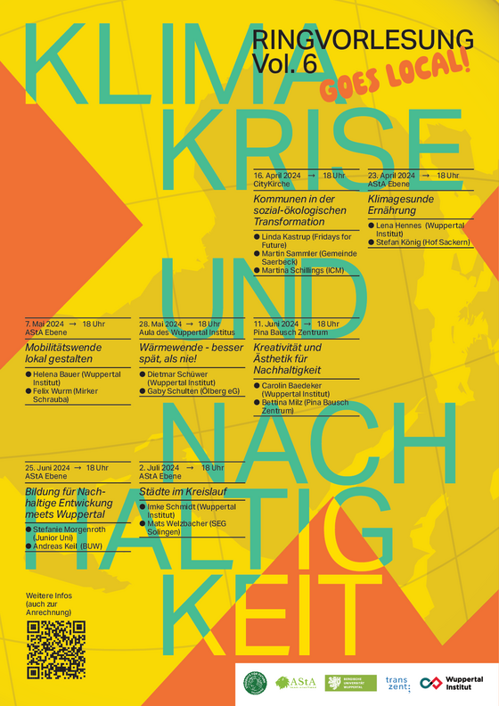 Das transzent, der AStA und die Students for Future an der Bergischen Universität Wuppertal laden gemeinsam mit dem Wuppertal Institut zur sechsten Runde der Vorlesungsreihe “Klimakrise und Nachhaltigkeit” ein