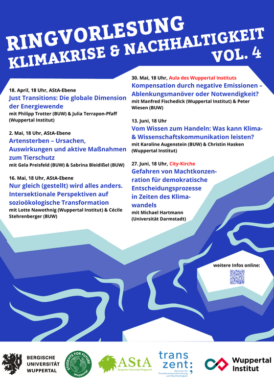 Das Zentrum für Transformationsforschung und Nachhaltigkeit (transzent), der Allgemeine Studierendenausschuss (AStA) und die Students for Future an der Bergischen Universität Wuppertal laden gemeinsam mit dem Wuppertal Institut zur siebten Runde der Vorlesungsreihe „Klimakrise und Nachhaltigkeit” ein.