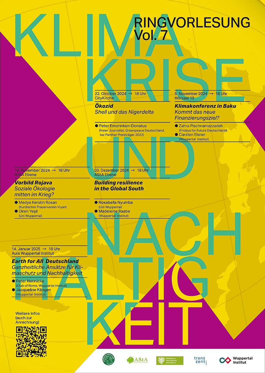 - 03.12.2024, AStA-Ebene (Ebene ME.04, Max-Horkheimer-Straße 15, 42119 Wuppertal): Building resilience in the Global South; Rosebella Nyumba (Bergische Universität), Madeleine Raabe (Wuppertal Institut)