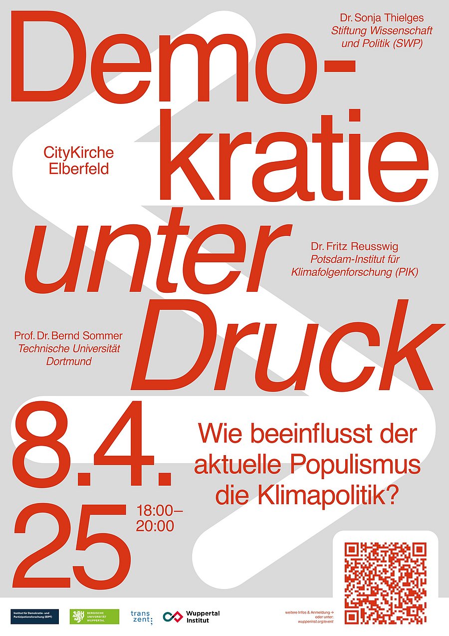 Am 8. April 2025 um 18 Uhr laden das Zentrum für Transformationsforschung und Nachhaltigkeit (transzent) der Bergischen Universität Wuppertal und das Wuppertal Institut zur Veranstaltung "Demokratie unter Druck: Wie beeinflusst der aktuelle Populismus die Klimapolitik?" in die CityKirche Elberfeld nach Wuppertal ein.
